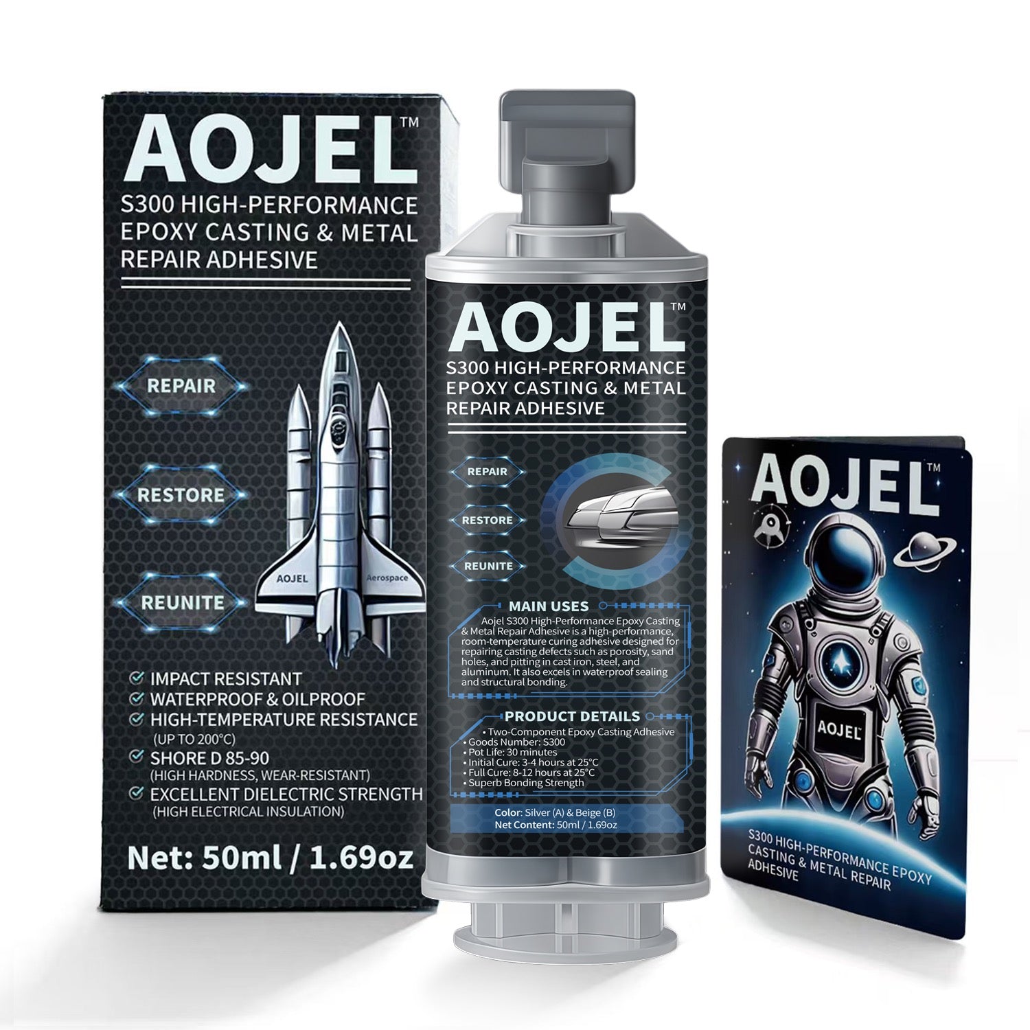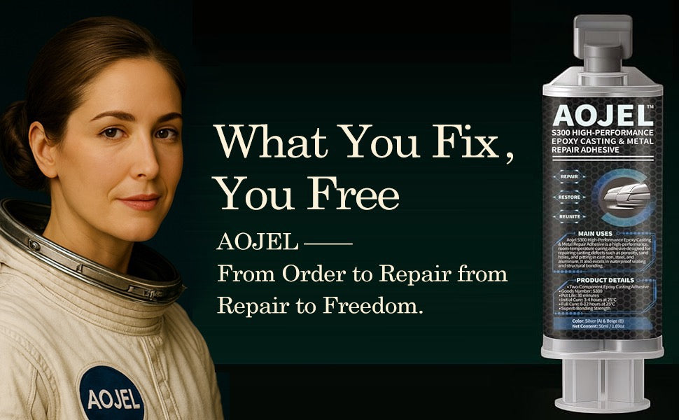 AOJEL™ 2-Part Heavy-Duty Metal Epoxy Glue – Aerospace-Inspired Structural Adhesive for Precision Metal Repair | 392 °F Heat-Resistant | 5500 PSI Strength | Industrial-Class Reliability Aerospace-Inspired Structural Formula — Derived from AOJEL™ S-Series engineering epoxy, designed for critical-load metal restoration. True Structural Re-Bonding — Not surface patching; rebuilds molecular continuity between fractured metal parts. Professional Dual-Component System — 1 : 1 mix ratio for precision blending and uniform polymerization every time. Thermal Stability up to 392 °F (200 °C) — Maintains integrity under engine heat, friction, or industrial cycles. Impact-Resistant Bonding Strength (≈ 5500 PSI) — Engineered for torque, vibration, and continuous stress conditions. Dimensional Precision — Controlled viscosity allows exact alignment, zero sag, and clean joint geometry. Waterproof / Oil-Resistant / Chemical-Shielded — Ideal for mechanical, marine, and automotive environments. Machinable & Paintable After Cure — Once set, behaves like metal: can be drilled, sanded, and coated. Industrial-Class Reliability — Trusted for professional maintenance where replacement is not an option. AOJEL™ Repair Philosophy — Every bond is a promise of precision, integrity, and permanence. AOJEL™ 2-Part Heavy-Duty Metal Epoxy Glue is the premium evolution of the renowned S300 system — formulated for professionals who demand structural certainty under pressure.Its dual-component epoxy chemistry ensures a molecular-level re-bond that restores metal integrity rather than coating the surface.With heat stability up to 392 °F (200 °C) and ≈ 5500 PSI tensile strength, it performs flawlessly across steel, aluminum, and composite assemblies.Resistant to water, oil, and vibration, AOJEL™ Heavy-Duty is designed for precision, reliability, and long-term performance in critical mechanical environments. This is not an adhesive. It’s engineered permanence.